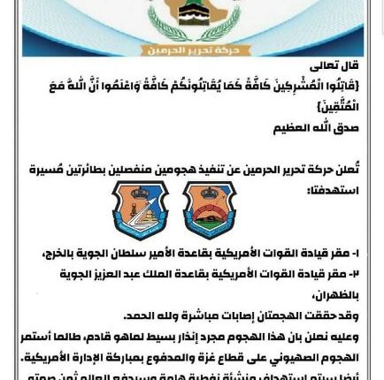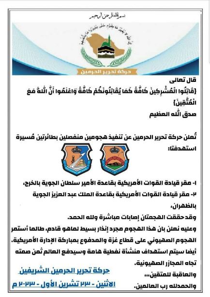 وقالت حركة (تحرير الحرمين) في بيان إنها ” نفذت هجومين جويين منفصلين بطائرتين مسيرة استهدفتا مقر قيادة القوات الأمريكية بقاعدة سلطان الجوية في الخرج، ومقر قيادة القوات الأمريكية في قاعدة عبدالعزيز الجوية بالظهران”.
