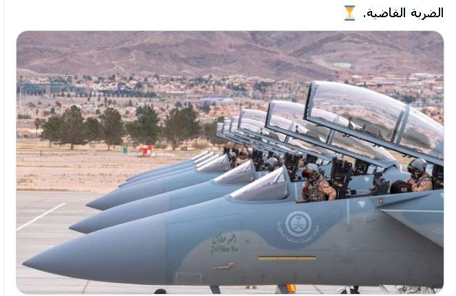 ونشر حساب (كولومبوس) التابع لمستشار ولي العهد السعوديّ سعود القحطاني على (إكس) صورة لمقاتلات سعوديّة من نوع F – 15 وإلى جانبها تعليق مقتضب (الضربة القاضية) في تهديد يتطابق مع الذي أطلقه قائد القوات الجوية الإسرائيلية وإلى خلفه مقاتلة إسرائيلية F – 15 بشن عدوان على صنعاء.