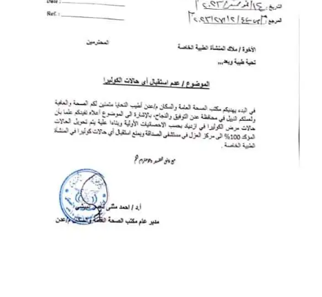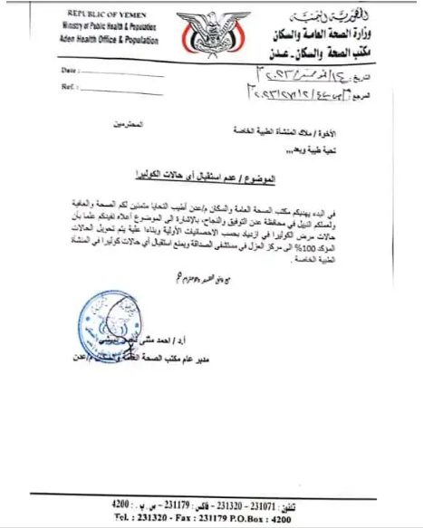 واعترف مكتب الصحة بالمدينة في تعميم صادر عنه منع استقبال الحالات المصابة بالكوليرا في كافة مستشفيات عدن، والعمل على تحويلها إلى مركز العزل في مستشفى الصداقة التعليمي بمنطقة الشيخ عثمان الذي يفتقر لأبسط الخدمات الصحية.