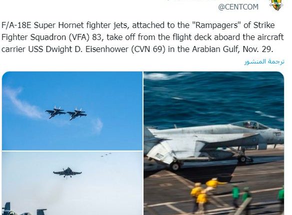 ونشرت القيادة المركزية للقوات الامريكية صورا خلال بدء مقاتلات أمريكية عمليات استطلاعية من على متن حاملة الطائرات “يو اس ايزنهاور”.