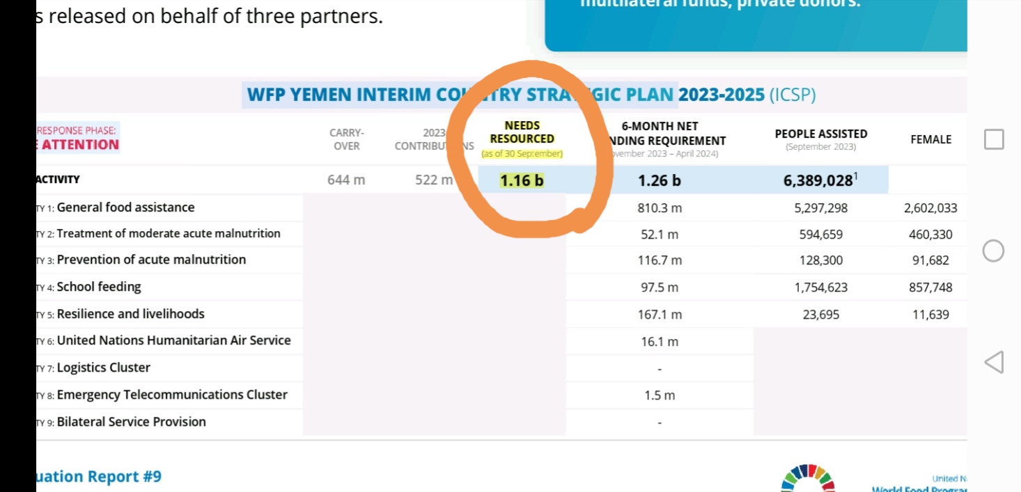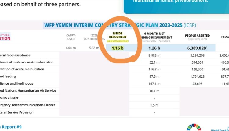 حسب التقارير الرسمية تبين أن تمويلات برنامج الغذاء العالمي العام الماضي 2022 بلغت 1.1 مليار دولار ولم يعلن البرنامج العام الماضي إيقاف مساعداته كما فعل الآن، المفاجأة هي أن تمويلات البرنامج خلال 9 أشهر فقط من العام الحالي 2023 بلغت أكثر من تمويلاته للعام الماضي كاملاً، حيث حصل البرنامج بحسب وثائقه الرسمية على مبلغ 1.16 مليار دولار هذا المبلغ هو ما تلقاه البرنامج حتى نهاية سبتمبر الماضي أي أن تمويل البرنامج لتسعة أشهر من هذا العام أكثر من تمويله للعام الماضي كاملاً وفارق الزيادة في التمويلين هو 60 مليون دولار، ومع ذلك أعلن الغذاء العالمي في اليمن وقف مساعداته الإغاثية متخذاً من نقص التمويل مبرراً لذلك.