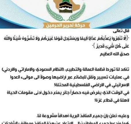 وقالت حركة (تحرير الحرمين الشريفين) في بيان إنه “تأكّـد لها تورط أنظمة العمالة والتطبيع النظام السعوديّ والإماراتي والاردني في عمليات تسيير ونقل البضائع عبر أراضيها وُصُـولاً إلى موانئ العدوّ الإسرائيلي في الأراضي الفلسطينية المحتلّة، في الوقت الذي يفرض فيه حصارا جائرا يمنع دخول أدنى مقومات الحياة لأهلنا في قطاع غزة”.