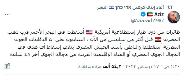 وأعاد الصحفي الإسرائيلي أيدي كوهين نشر تغريدة تفيد بأن الولايات المتحدة تعتقد بأن الجيش المصري من يقف وراء اسقاط المسيرة الامريكية قبالة ساحل دهب على البحر الأحمر على الرغم من نفي ناطق الجيش المصري اسقاط أي هدف خلال اليومين الأخيرين.