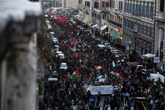 وفي إيطاليا دعت الحركة الطلابية الفلسطينية لتظاهرة شارك بها الآلاف في العاصمة روما، ورفعوا يافطات تدعم الفلسطينيين وهتفوا لوقف الحرب، كما أشعلوا الشموع وطالبوا بوقف الإبادة الجماعية على حدّ تعبيرهم.