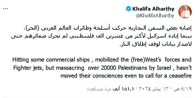 وقال وكيل وزارة الخارجية العمانية خليفة الحارثي في تدوينة على ( اكس ) : ” إصابة بعض السفن التجارية حركت أسلحة وطائرات العالم الغربي (الحر) “.