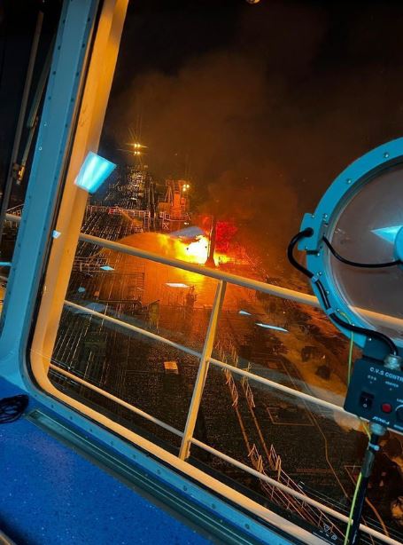 مضيفة أنه تم إخلاء السفينة بعد أن امتداد الحريق إلى غالبيتها وإلتهمت ألسنة اللهب حمولتها المقدرة بمليون برميل من مادة النافثا النفطية .
