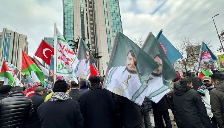 احتشد متظاهرون، الأحد، أمام القنصلية الإسرائيلية في مدينة إسطنبول التركية رافعين صور زعيم حركة أنصار الله عبدالملك الحوثي والأعلام الفلسطينية.