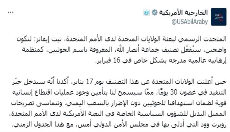 ونشر حساب وزارة الخارجية الامريكية بمواقع التواصل الاجتماعي تصريح منسوب لمتحدث البعثة الامريكية في الأمم المتحدة نيت ايفانز يؤكد فيه بأن قرار تصنيف انصار الله على لائحة العقوبات الامريكية سيفعل في الـ16 من الشهر الجاري.