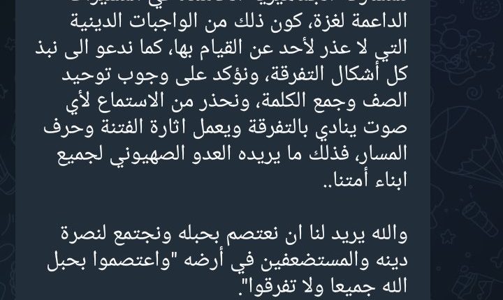كما دعا الى المشاركة في التظاهرات الشعبية المساندة لغزة , محذرا من دعوات الفتنة والتفرقة واعتبرها خدمة للعدو الصهيوني , وشدد على أهمية نبذ الفرقة وتوحيد الصف .