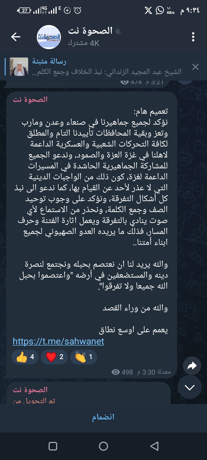 وأصدرت منصة الصحوة نت في التليجرام  الناطقة الرسمية باسم حزب الإصلاح ، تعمميا اعلنت فيه لجميع أبناء الشعب اليمني في صنعاء وعدن وتعز ومأرب وبقية المحافظات التأييد المطلق لكل التحركات الشعبية والعسكرية المساندة لأهلنا في غزة وفق نص التعميم .