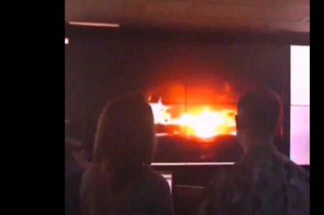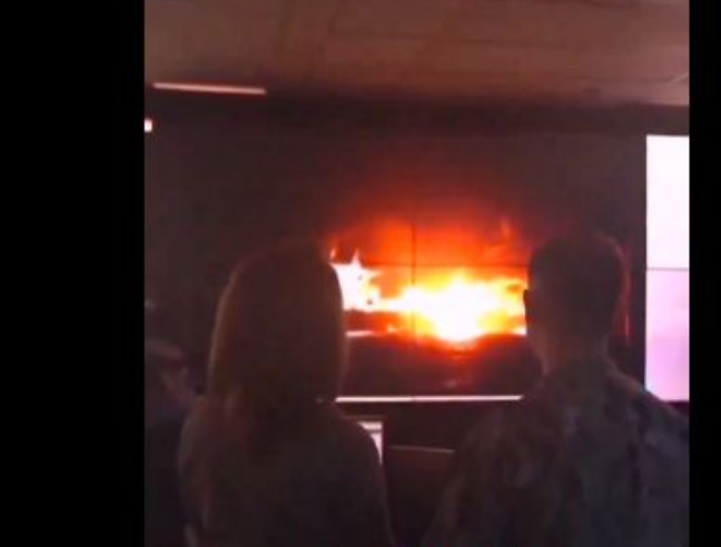 وكانت المذيعة تسأل القائد الأمريكي عن ما يمكن للصاروخ اليمني تحقيقه ليرد عليها بلقطة مرعبة للحظة انفجار صاروخ يمني فوق مدمّـرة أمريكية..