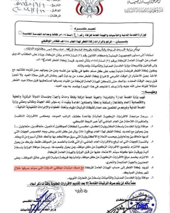 أصدر كُلٌّ من وزارة الخدمة المدنية وهيئة الزكاة التابعتين لحكومة صنعاء، الإثنين، تعميماً مشتركاً هاماً بشأن زكاة الفطر لهذا العام 1445هـ.