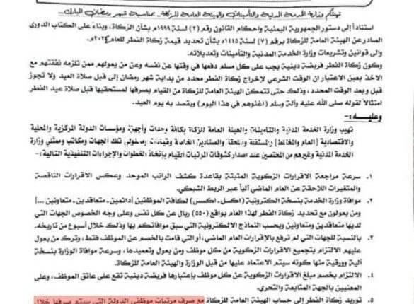 أصدر كُلٌّ من وزارة الخدمة المدنية وهيئة الزكاة التابعتين لحكومة صنعاء، الإثنين، تعميماً مشتركاً هاماً بشأن زكاة الفطر لهذا العام 1445هـ.
