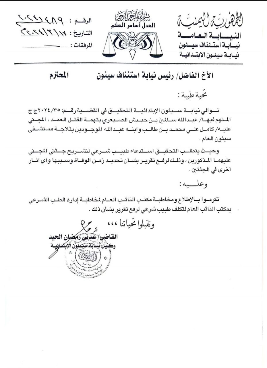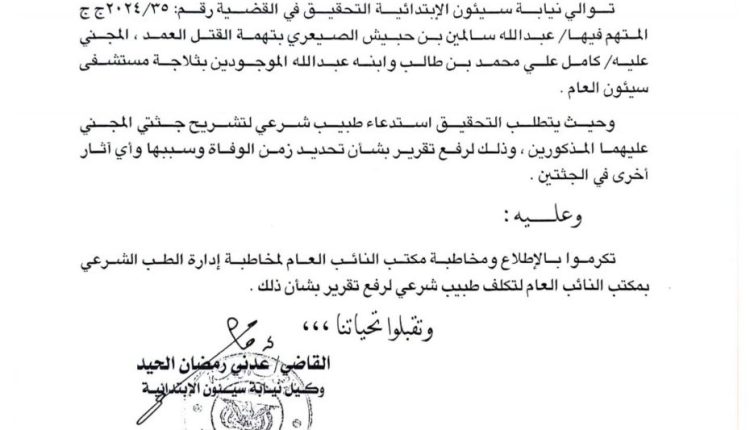 وطالبت نيابة استئناف مدينة سيئون الابتدائية في وثيقة لها صادرة مطلع الاسبوع الجاري استمرار التحقيق في القضية رقم “٢٠٢٤/٣٥ ج ج” والمتهم فيها مدير أمن حضرموت الوادي عبد الله سالمين بن حبيش الصيعري، بتهمة القتل العمد للمجني عليهما كامل علي محمد بن طالب الكثيري ونجله عبد الله، الموجودين بثلاجة مستشفى سيئون العام