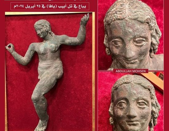 وقال الباحث اليمني المتخصص باثار الحضارات اليمنية  القديمة  عبدالله محسن إن “تمثال برونزي أثري نادر لشاب من اليمن القديم، من داخل صالة عرض مزاد تل أبيب (يافا) عرضت أمس الأحد في تلك المعرض”.