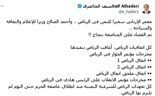 مضيفاً : ” كل اتفاقيات الرياض، أعاقت الرياض تنفيذها: مخرجات مؤتمر الحوار في الرياض، اتفاق الرياض 1.. اتفاق الرياض 2 .. اتفاق ملحق اتفاق الرياض .. مخرجات مؤتمر الانقلاب على هادي في الرياض “.