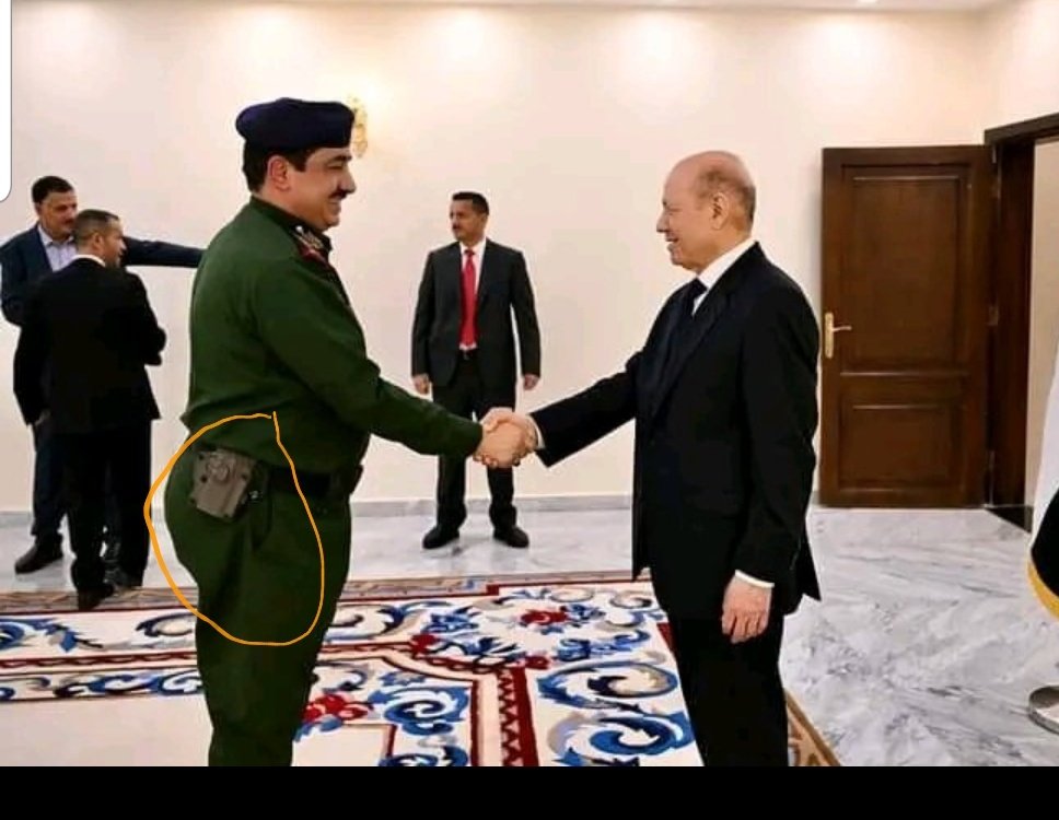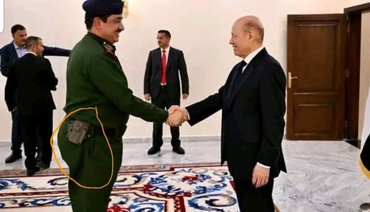 وأظهرت صور للقيادي المحسوب على حزب الإصلاح إبراهيم حيدان يصافح العليمي في حفل الاستقبال في قصر معاشيق، وهو مجرد من مسدسه، على الرغم من حمل قيادات في المجلس الانتقالي المدعوم إماراتياً أسلحتهم.