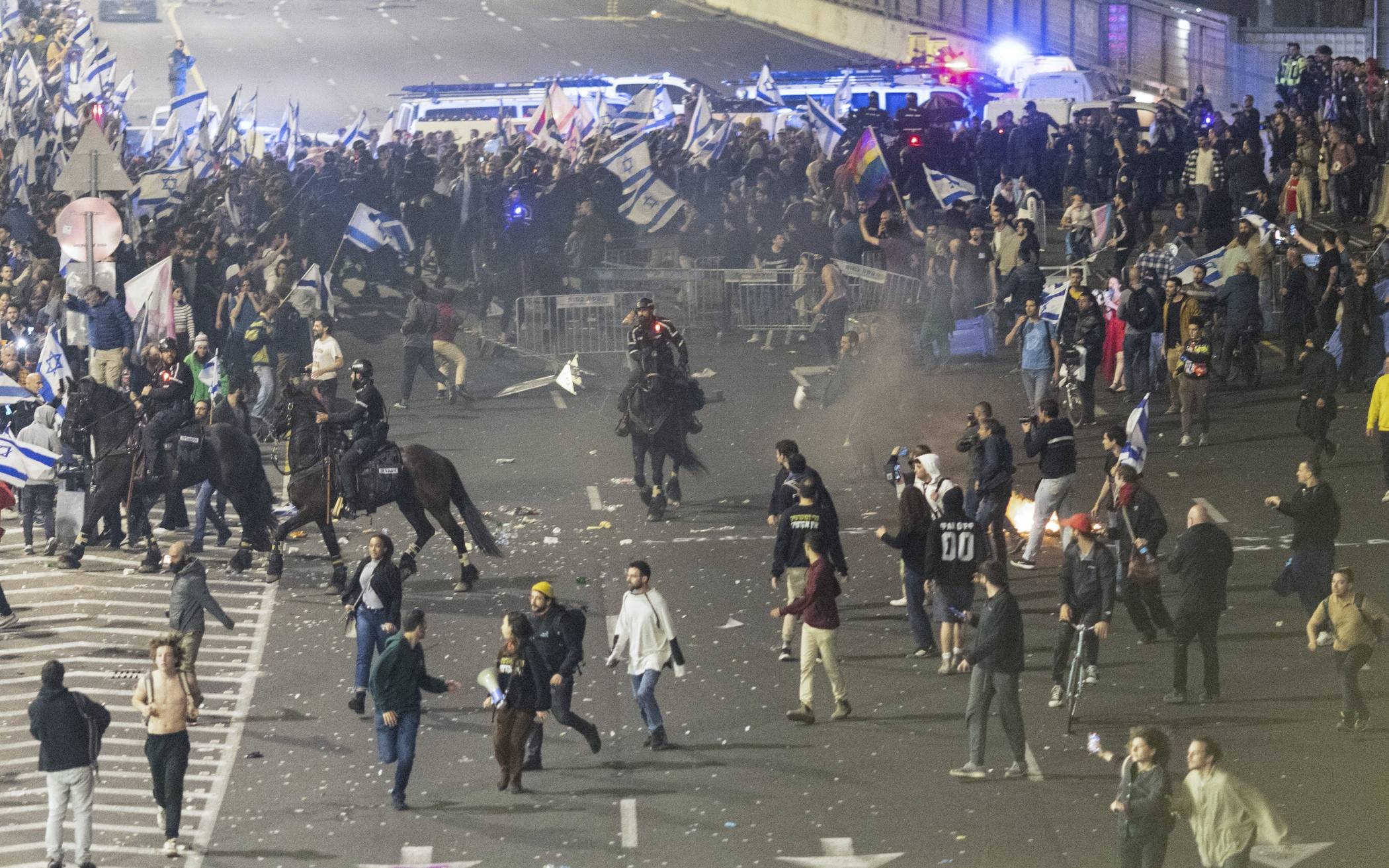 وأطلق المتظاهرون المفرقعات النارية، وأشعلوا النيران وصبغوا أياديهم باللون الأحمر أمام منزل نتنياهو، مطالبين بضرورة التحرك لإطلاق سراح الأسير الإسرائيلي هيرش جولدبيرغ بولين ورفاقه.