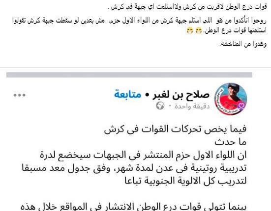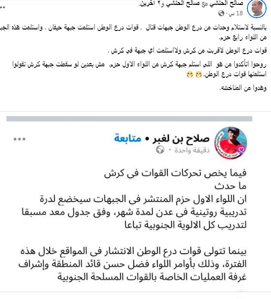 وأشار الحنشي في منشور على صفحته بمواقع التواصل الاجتماعي إلى أن قوات درع الوطن لم تتسلم جبهة كرش وانما حيفان فقط ضمن ترتيبات خاصة، ملمحاً إلى قرار الانتقالي تسليم كرش لصنعاء.