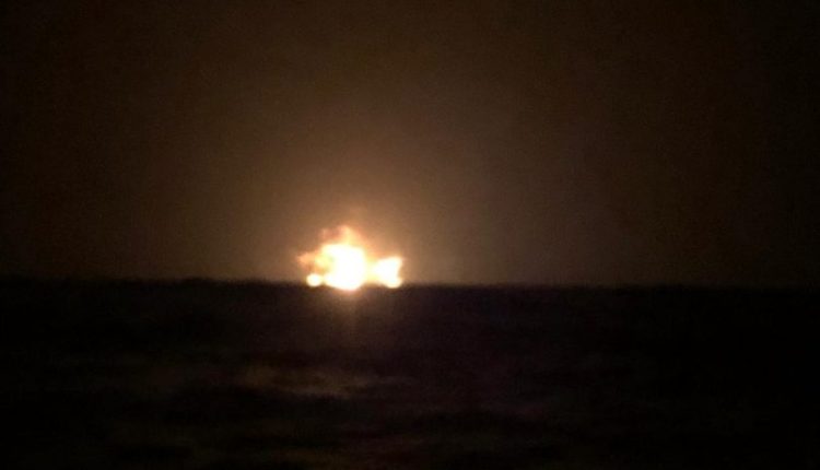 حريقٌ يلتهمُ سفينةً عقبَ قصفِها في بحرِ العرب