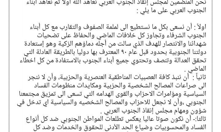 وتداول ناشطون من أبناء المحافظات الجنوبية ما يسمى “ميثاق الشرف” للانضمام إلى المجلس والذي يدعو إلى “وحدة الصف ونبذ العصبية والمناطقية والحزبية بعيدا عن المصالح الشخصية والحزبية” في إشارة إلى السياسات التي انتهجها “الانتقالي الجنوبي”.