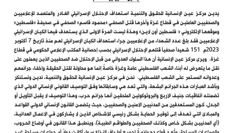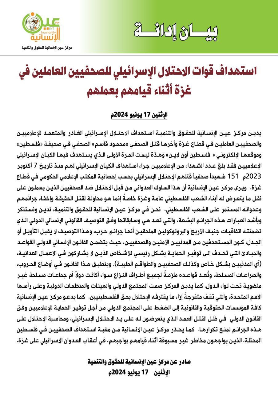 إدان مركز عين الإنسانية للحقوق والتنمية استمرار استهداف الاحتلال الإسرائيلي المتعمد للإعلاميين في قطاع غزة، أثناء قيامهم بعملهم كان آخرها استهداف الاحتلال للصحفي محمود قاسم -الصحفي في صحيفة «فلسطين» وموقعها الإلكتروني ما أدى إلى استشهاده.