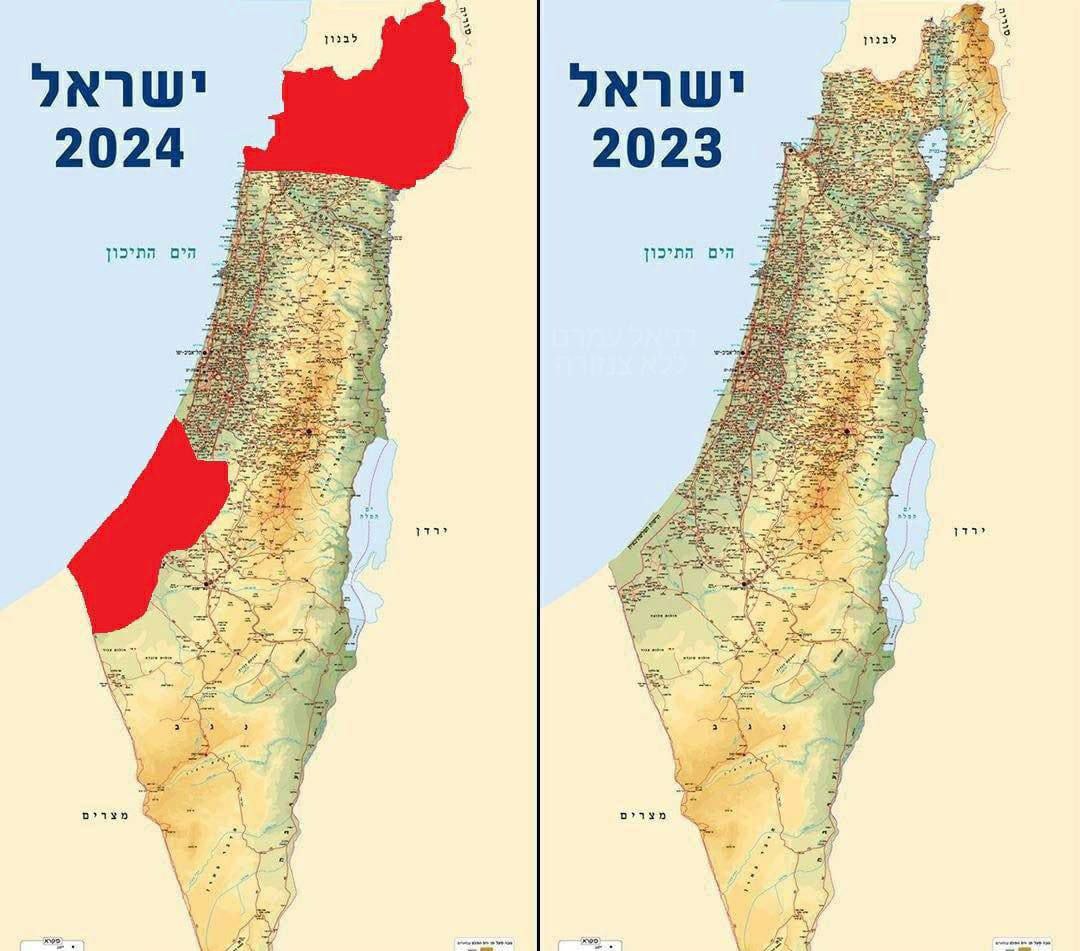 الإعلام العبري ينشر هذه الصورة ويقول: حَجمُ الدَولة يتقلص. ولو دققت أكثر ستجدهم بينما هُم يتحدثون عن الأمر يذكرون “إسرائيل الكبرى” والحلم الذي يضيع.