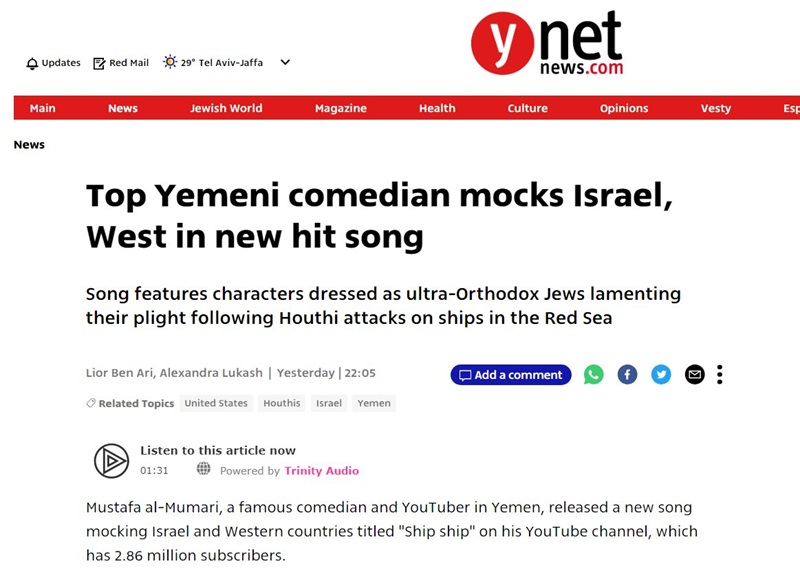 وقال موقع ” واي نت نيوز” العبري ان الفنان الكوميدي الشهير واليوتيوب في اليمن مصطفى المومري ، أطلق أغنية جديدة تسخر من إسرائيل والدول الغربية بعنوان “سفينة سفينة” عبر قناته على اليوتيوب، والتي يبلغ عدد مشتركيها 2.86 مليون مشترك.
