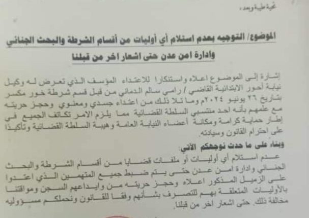 وطالب رئيس نيابة عدن وضاح باذيب أمس الأربعاء كافة النيابات بمناطق عدن عدم استلام أي أوليات أو ملفات قضايا من أقسام الشرطة والبحث الجنائي وإدارة أمن عدن، حتى يتم ضبط المتهمين الذين اعتدوا على وكيل نيابة أحور في محافظة أبين رامي سالم الدماني، من قبل عناصر مسلحة في “شرطة خور مكسر” تابعة للانتقالي.