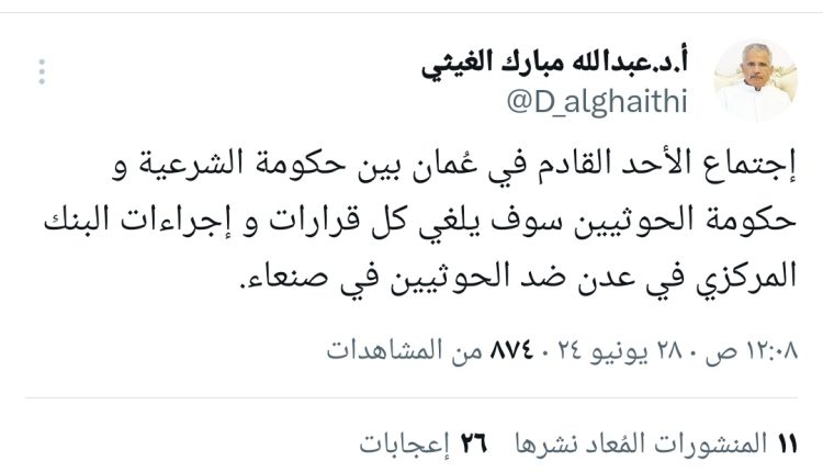 وقال القيادي في المجلس الانتقالي بحضرموت ، عبدالله مبارك الغيثي في تدوينة على (اكس): ” إجتماع الأحد القادم في عُمان بين حكومة (الشرعية) وحكومة الحوثيين سوف يلغي كل قرارات وإجراءات البنك المركزي في عدن ضد صنعاء “.