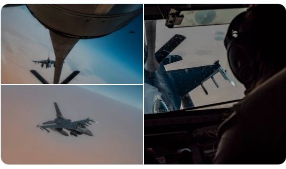 وتظهر الصور قيام طائرة وقود أمريكية كيه سي -135 بتزويد مقاتلات عسكرية من نوع اف 16 فايتنج فالكون بالوقود جواً..