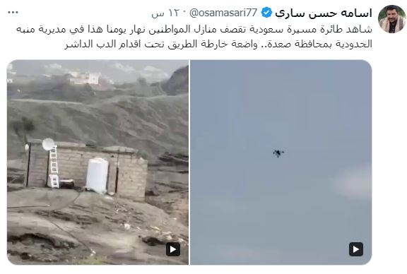 وتداول ناشطون صوَرًا لطائرات مسيرة انطلقت من السعودية وهي تقصف منازل المواطنين في مديرية منبه على الحدود الجنوبية للسعودية.