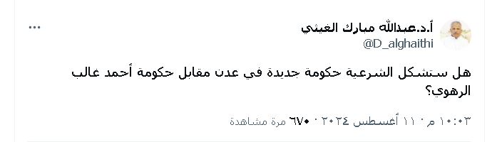 وقال القيادي في الانتقالي عبدالله مبارك الغيثي في تدوينة على ( اكس ) : ” هل ستشكل ( الشرعية ) حكومة جديدة في عدن مقابل حكومة أحمد غالب الرهوي؟ “.