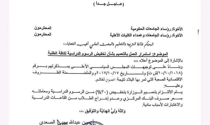 وجَّهت وزارة التربية والتعليم والبحث العلمي بحكومة صنعاء العمل وفق تعميم جديد على جميع الجامعات الحكومية والخَاصَّة.