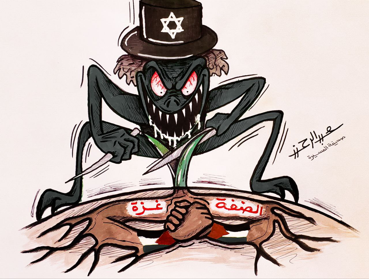 كاريكاتير يُجْلِي الوَحدةَ والتعاضُدَ بين المجاهدين الفلسطينيين في غزة والضفة الغربية