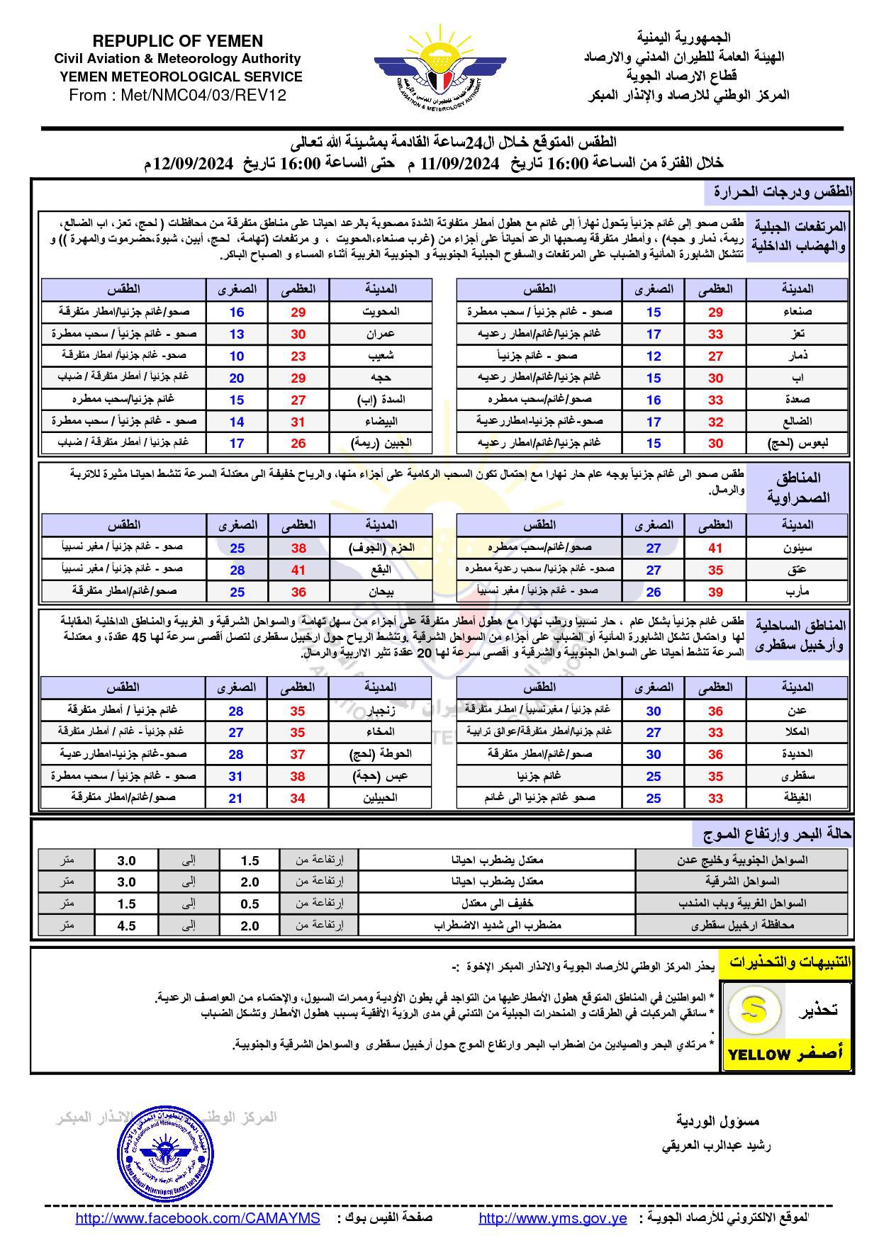 توقَّعَ المركَزُ الوطني للأرصاد والإنذار المبكر، طقسًا صحوًا إلى غائم جزئياً يتحول نهاراً إلى غائم مع هطول أمطار متفاوتة الشدة مصحوبة بالرعد أحياناً على مناطق متفرقة من محافظات (لحج، تعز، إب، الضالع، ريمة، ذمار وَحجه).
