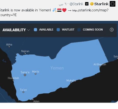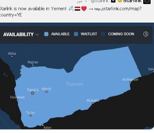وأشَارَ ماسك في منشور على صفحته بمواقع التواصل الاجتماع إلى أن الانترنت الفضائي عبر الأقمار الصناعية “ستارلينك” أصبحت متاحة لأول مرة في اليمن.. ومع أن اليمن ليست بلدا ذات أهميّة اقتصادية كبيرة للشركة إلَّا أن توقيت الإعلان، وفق خبراء، حمل ابعاد عسكرية.