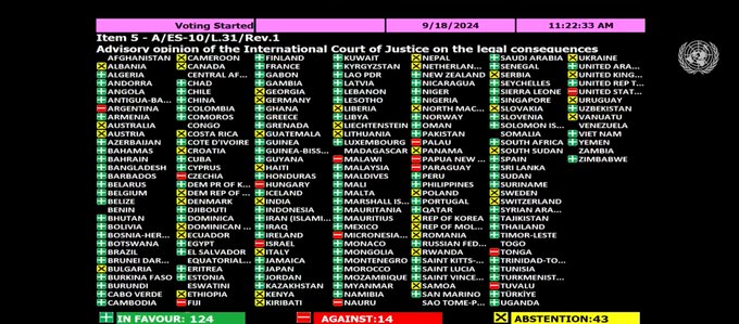 وتم اعتماد القرار، بأغلبية 124 صوتًا، بينما امتنعت 43 دولة عن التصويت، فيما عارضت القرار 14 دولة، تشمل: الولايات المتحدة الأميركية، الأرجنتين، الباراغواي، جمهورية التشيك، هنغاريا، فيجي، وملاوي، وميكرونيزيا، وبابوا غينيا الجديدة، وبالاو، وتونغا، وتوفالو، ناورو، بالإضافة إلى كيان الاحتلال.