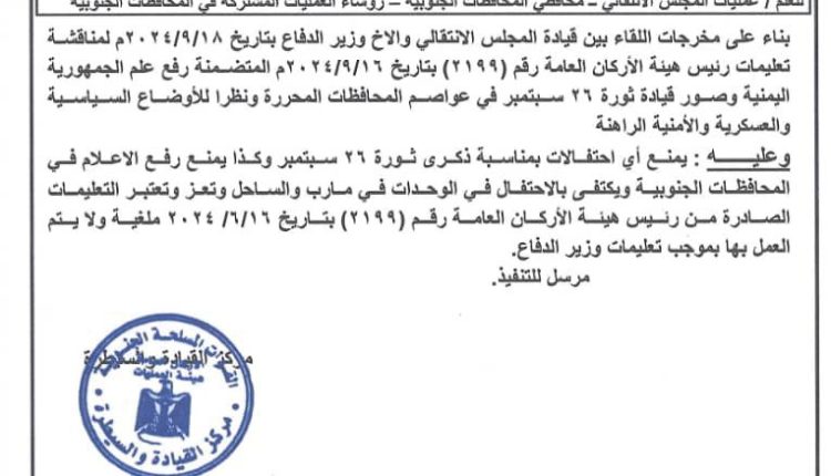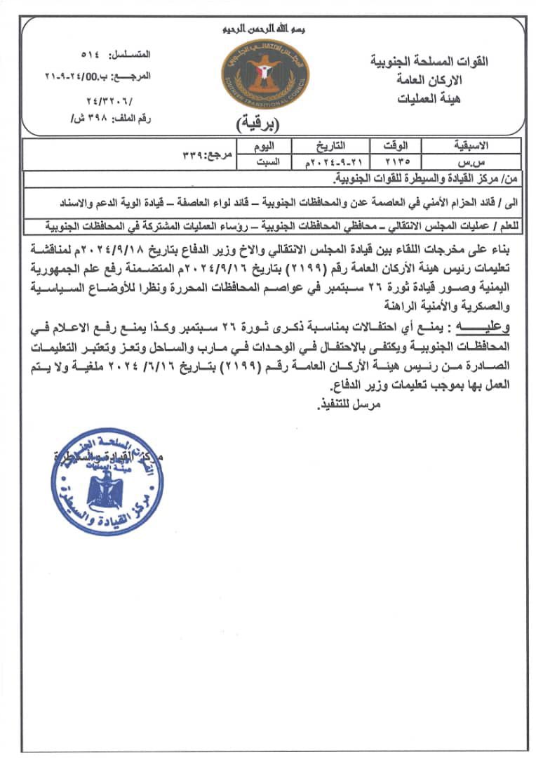 ونصت التعليمات الصادرة من مركز القيادة والسيطرة بقوات الانتقالي بإلغاء التعليمات الصادرة من رئيس هيئة الأركان بالاحتفال بذكرى ثورة 26سبتمبر ، او رفع اعلام الجهورية , والاكتفاء بالاحتفالات في مدينتي مأرب وتعز والساحل الغربي فقط .