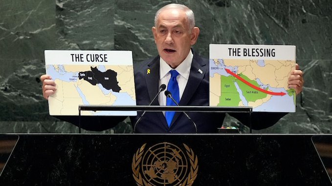 وعرض نتنياهو الخريطتين خلال كلمته في الجمعية العامة للأمم المتحدة في وقت سابق الجمعة.