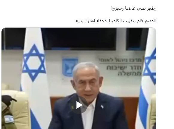 وقد دفعت رعشةُ نتنياهو واهتزازُ البيان المكتوب، المصوِّرَ لتقريب الكاميرا بغية إزالة اثار الارتعاش دون جدوى.
