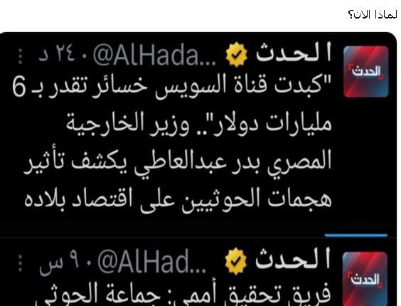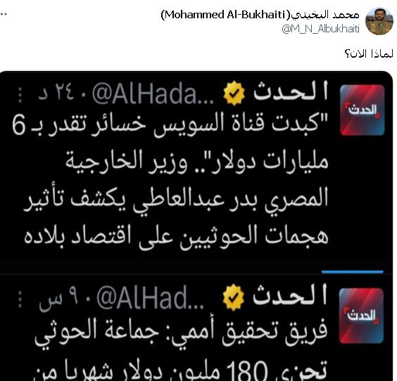 ونشرت قنوات تلفزيونية على راسها الحدث  تغريدات  بشأن خسائر مصر والتي تزعم فيها تجاوز الـ60 مليار دولار إضافة إلى حجم  العوائد التي  تجنيها اليمن من البحر الأحمر مع استمرار الهجمات ضد السفن المرتبطة بالاحتلال الإسرائيلي.