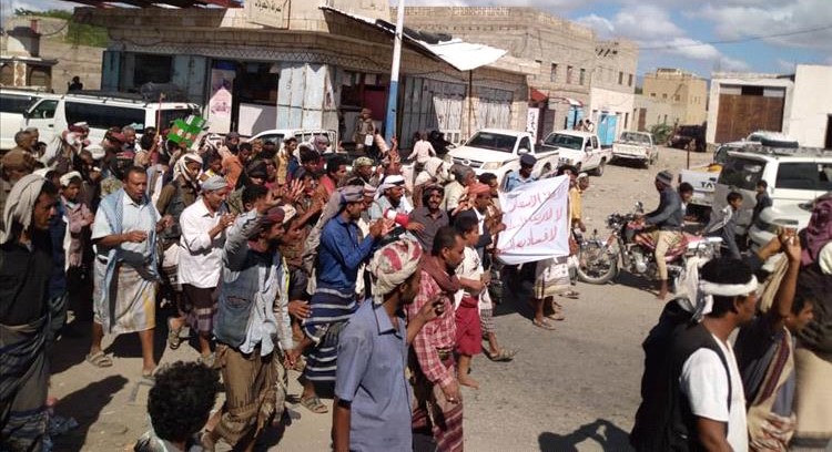 وشهدت مديرية المحفد، السبت، تظاهرة حاشدة تنديداً بتدهور العملة الوطنية وارتفاع أسعار المواد الغذائية، مطالبة بسرعة معالجة الأوضاع المعيشية الصعبة.