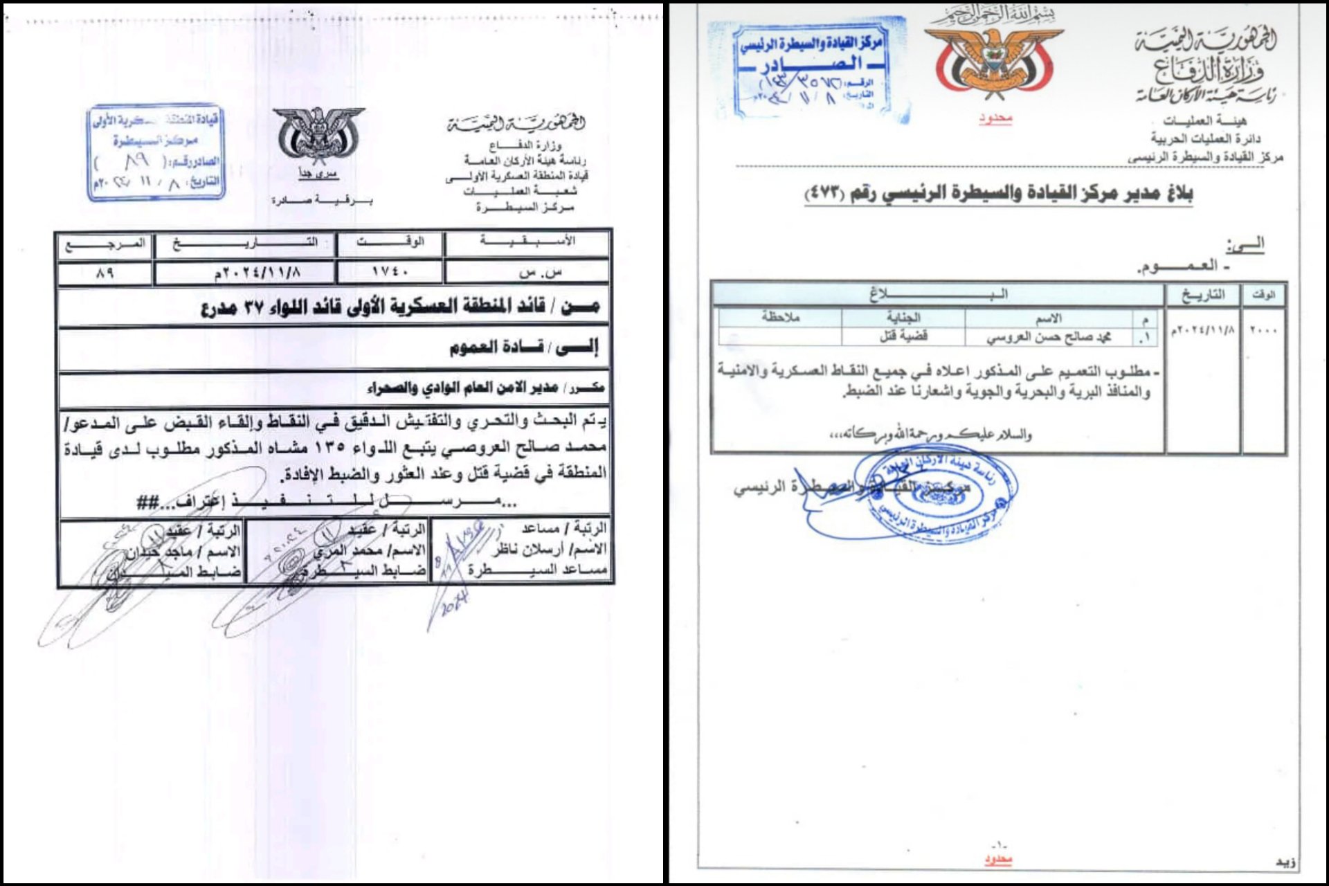 مشيرة إلى تمكن العروسي من الخروج من بوابة قيادة المنطقة بسلاحه الشخصي ، قبل أن يتم التعميم باسمه على جميع النقاط العسكرية في سيئون وحضرموت للقبض عليه .