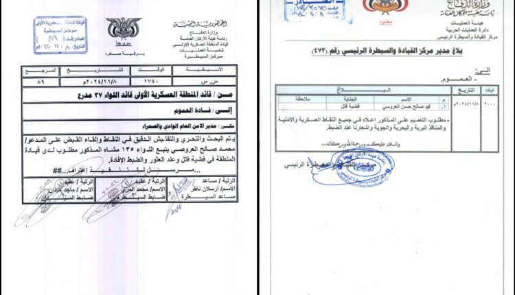 مشيرة إلى تمكن العروسي من الخروج من بوابة قيادة المنطقة بسلاحه الشخصي ، قبل أن يتم التعميم باسمه على جميع النقاط العسكرية في سيئون وحضرموت للقبض عليه .