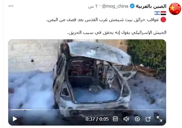 ونشرت صفحة الصين بالعربية  التابعة للخارجية الصينية مقطع فيديو  يظهر آثار الحرائق التي اندلعت في محيط قاعدة عسكرية استهدفتها القوات اليمنية.