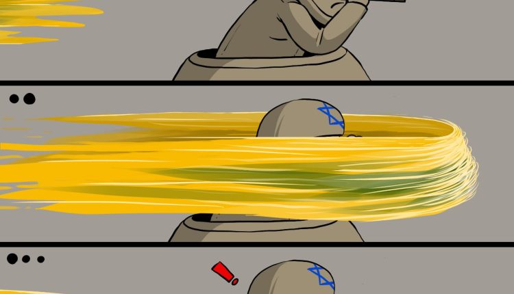 كاريكاتور يمني يصور المشهد اليومي الذي يواجهه جيش الاحتلال في الجنوب اللبناني من قبل المقاومة لمجرد التفكير في مكان مقاتلي حزب الله يأتي الرد من حيث لا يدري أو يشعر به حنود الاحتلال