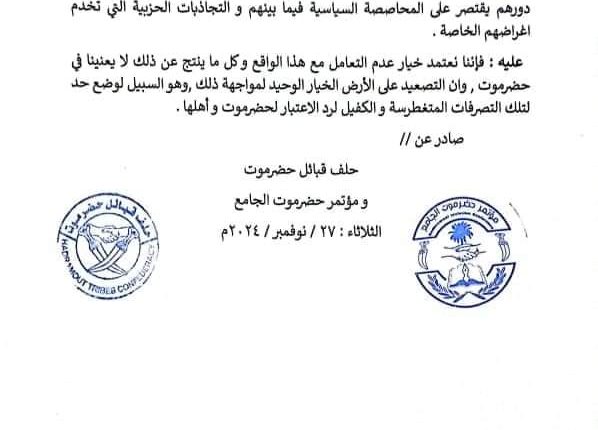 وقال الحلف والمؤتمر في بيان مشترك إنه “بعد مرور ما يقارب خمسة شهور على المواقف المعلنة عن مؤتمر حضرموت الجامع وحلف قبائل حضرموت، وتبني استحقاقات حضرموت المشروعة لصالح الشأن العام، اتضح وبما لا يدع مجالًا للشك أن مجلس القيادة الرئاسي لا يملك القرار الكافي لما يخدم الوطن”.