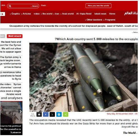 وقال موقع قناة “العالم” صراحة إن الإمارات أرسلت 5 آلاف قنبلة إلى العدوّ الإسرائيلي وهو ما جاء في ظلّ تواصل عدوانه على قطاع غزّة المحاصر.