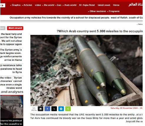 وقال موقع قناة “العالم” صراحة إن الإمارات أرسلت 5 آلاف قنبلة إلى العدوّ الإسرائيلي وهو ما جاء في ظلّ تواصل عدوانه على قطاع غزّة المحاصر.